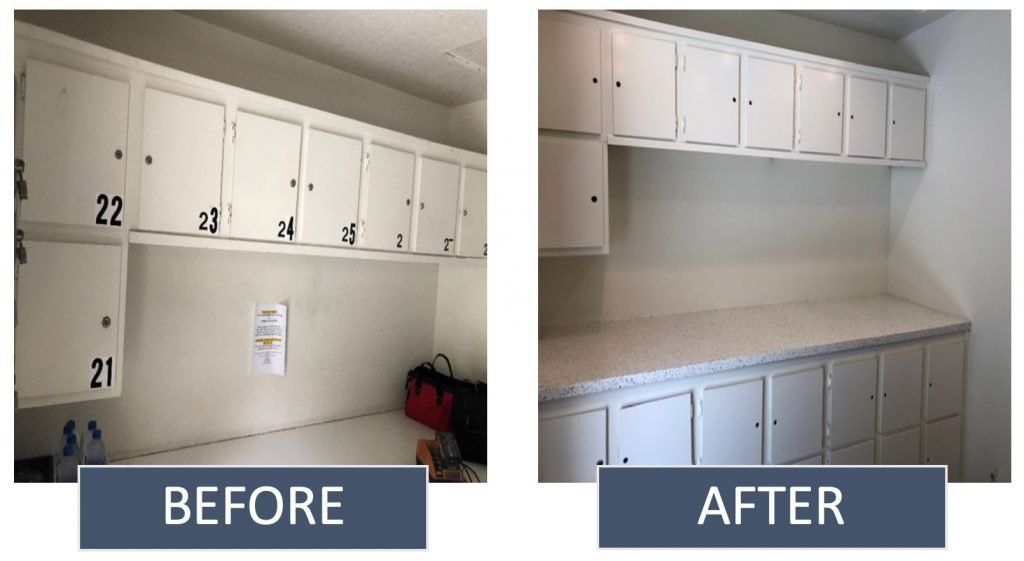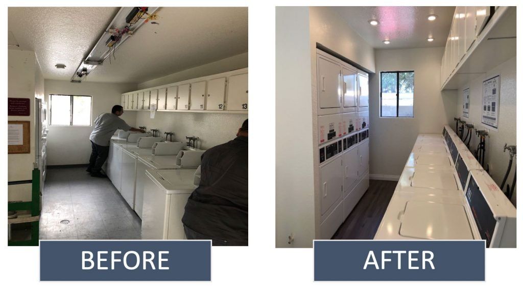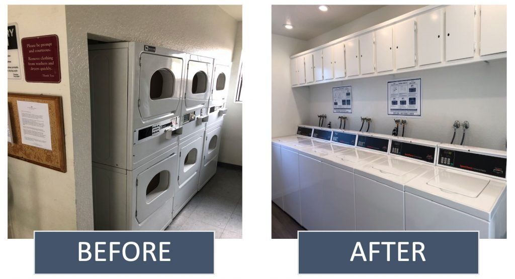 One of the most frequent requests was for the laundry rooms to be upgraded, have more reliable machines, and extended hours of operation. In response, we recently completed renovation of the first laundry room on the property. All the machines were replaced with new ones, the cabinets and countertops were refinished, and that laundry room is now accessible 24 hours a day. Our maintenance team consistently does amazing work, and this job was no exception. The before and after photos really highlight these improvements.